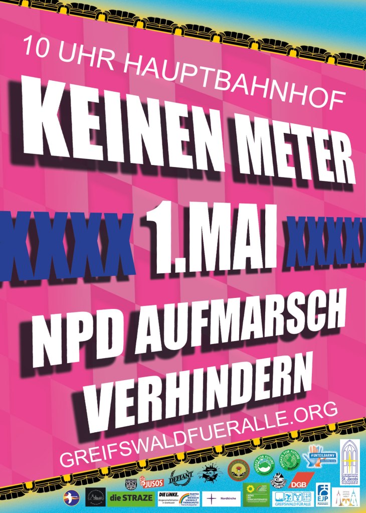 Die nationalsozialistische Ideologie hat zu den schlimmsten Verbrechen in der Geschichte der Menschheit geführt und ist heute immer noch eine tödliche Bedrohung. Das hat keinen Platz in Greifswald und nirgendwo sonst. Wir stellen uns dieser Bedrohung gemeinsam entgegen und werden den Neonazis der NPD und ihrer Ideologie (in unserem Greifswald) keinen Meter Straße überlassen. In der Vergangenheit haben wir Menschen in dieser Stadt immer wieder gezeigt, dass wir uns gegen Neonazis wehren. Das werden wir auch dieses Mal tun.