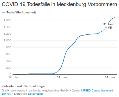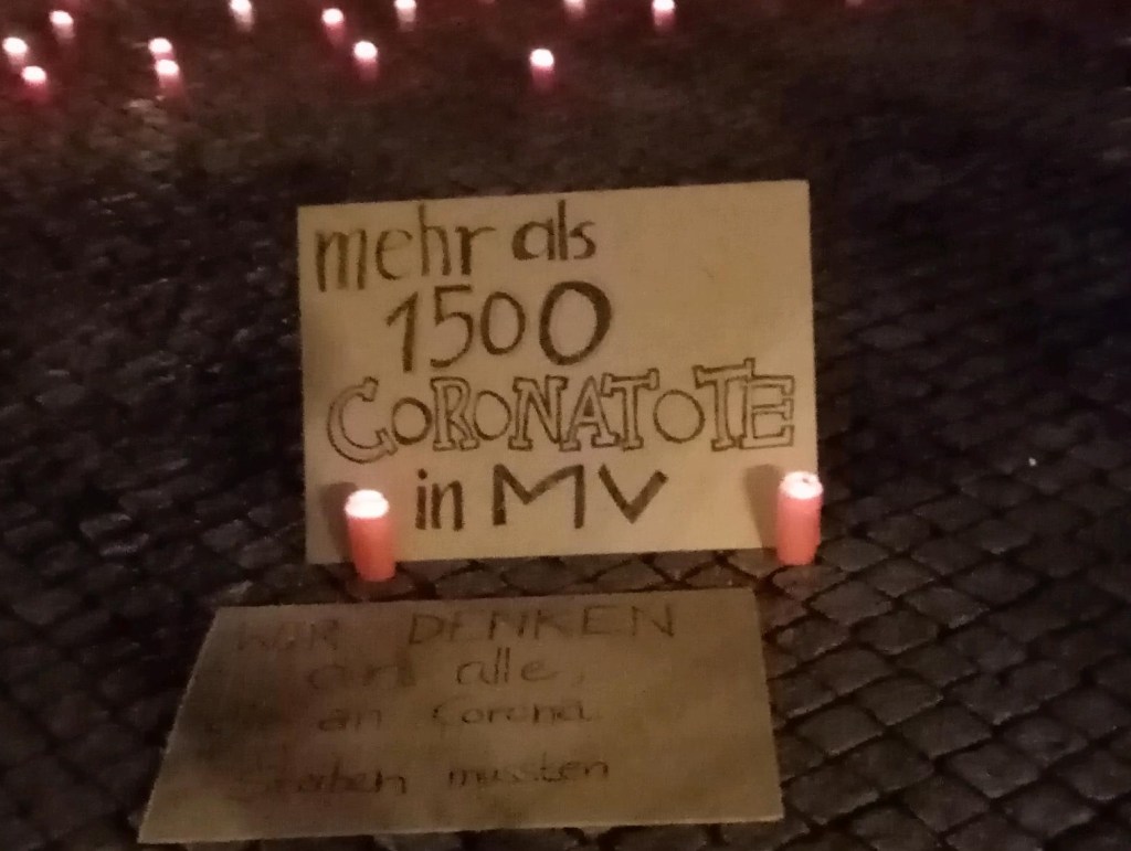 Mit Datum des 17.01.2022 starben im Bundesland Mecklenburg-Vorpommern 1.638 Menschen an oder mit Covid-19. Weltweit sind es mehr als 5 Millionen offizielle Tote. Covid-19 ist eine Krankheit mit zahlreichen Auswirkungen auf den menschlichen Körper, sodass eine Infektion mitunter nicht direkt für den Tod verantwortlich ist – aber die erkrankte Person ohne diese Infektion noch leben würde. Die Unterscheidung „an oder mit“ ist daher wichtig für bspw. die epidemiologische Forschung, aber für Erkrankte und die Angehörigen von Verstorbenen kann es auch als zynischer Umgang mit den tödlichen Risiken dieser Pandemie erscheinen, wenn diese Unterscheidung zur Relativierung von Covid-19 gebraucht wird.